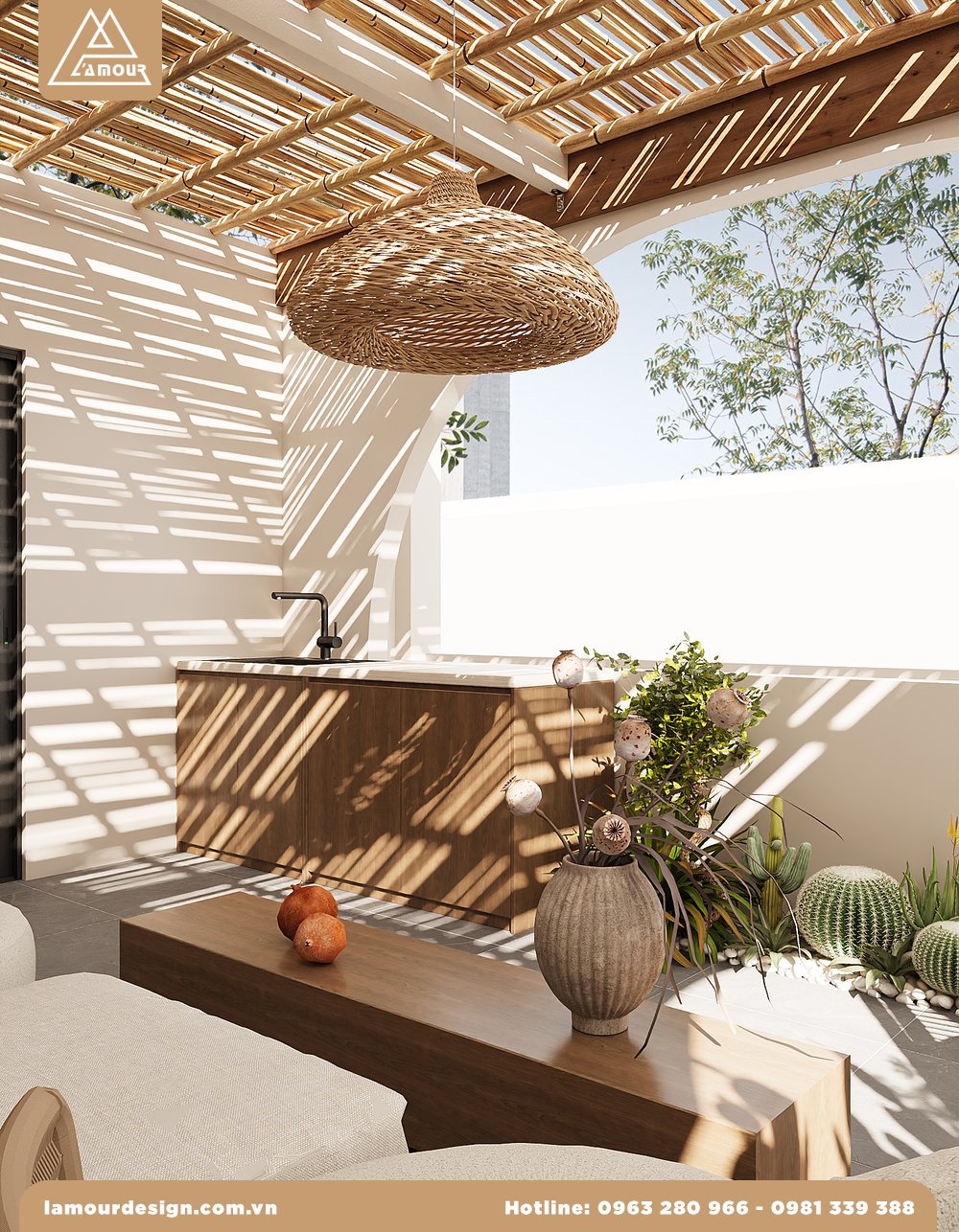 Ánh sáng tự nhiên được xem là một “vật liệu” quan trọng trong thiết kế này. Thay vì chỉ mở cửa sổ một cách thông thường, L’amour Design đã tạo ra những “khung tranh” nhìn ra bên ngoài, giúp gia chủ tận hưởng trọn vẹn khung cảnh mà vẫn giữ được sự riêng tư. Cách xử lý thông minh này giúp không gian bên trong luôn bừng sáng mà không bị gay gắt.