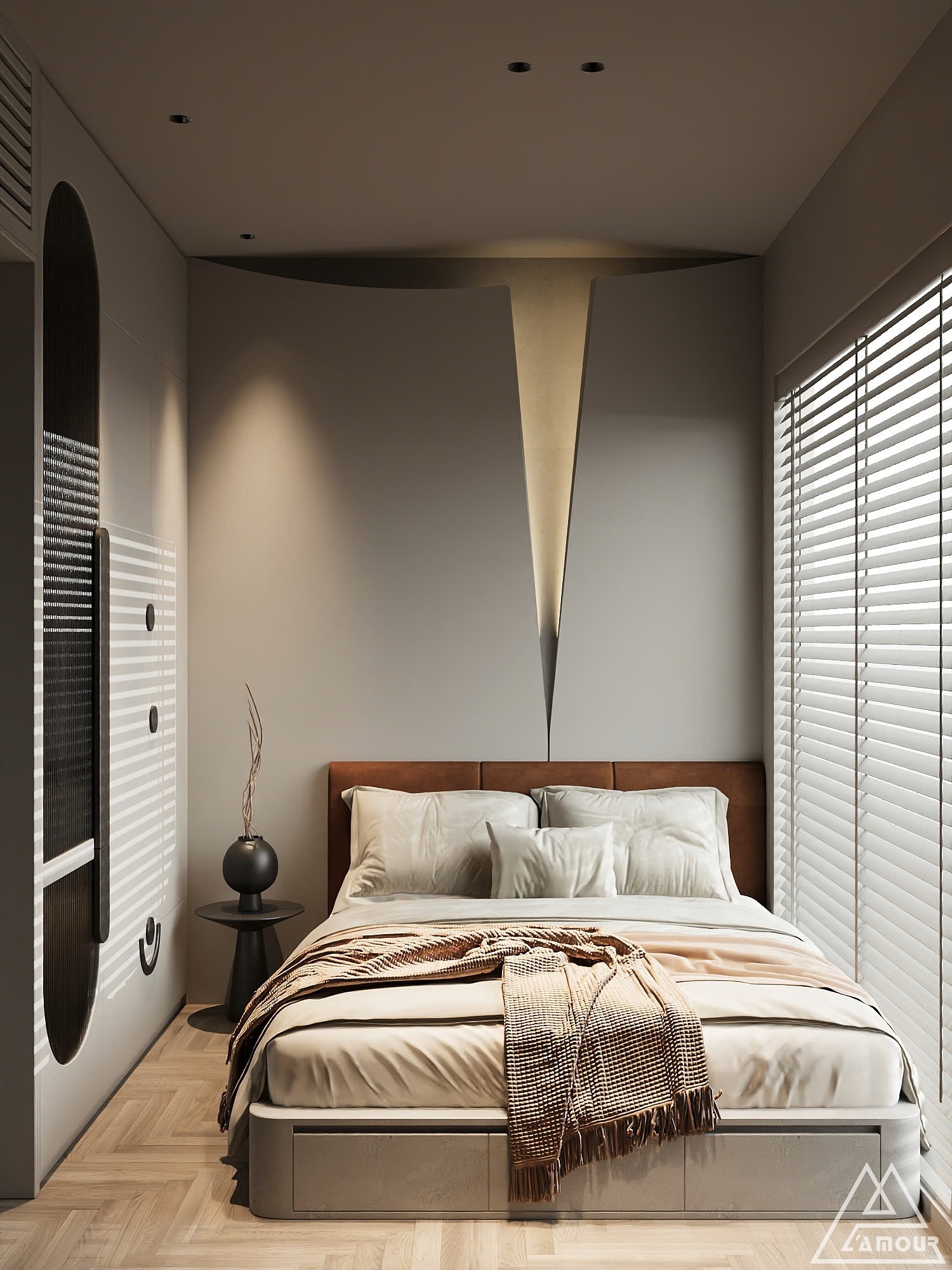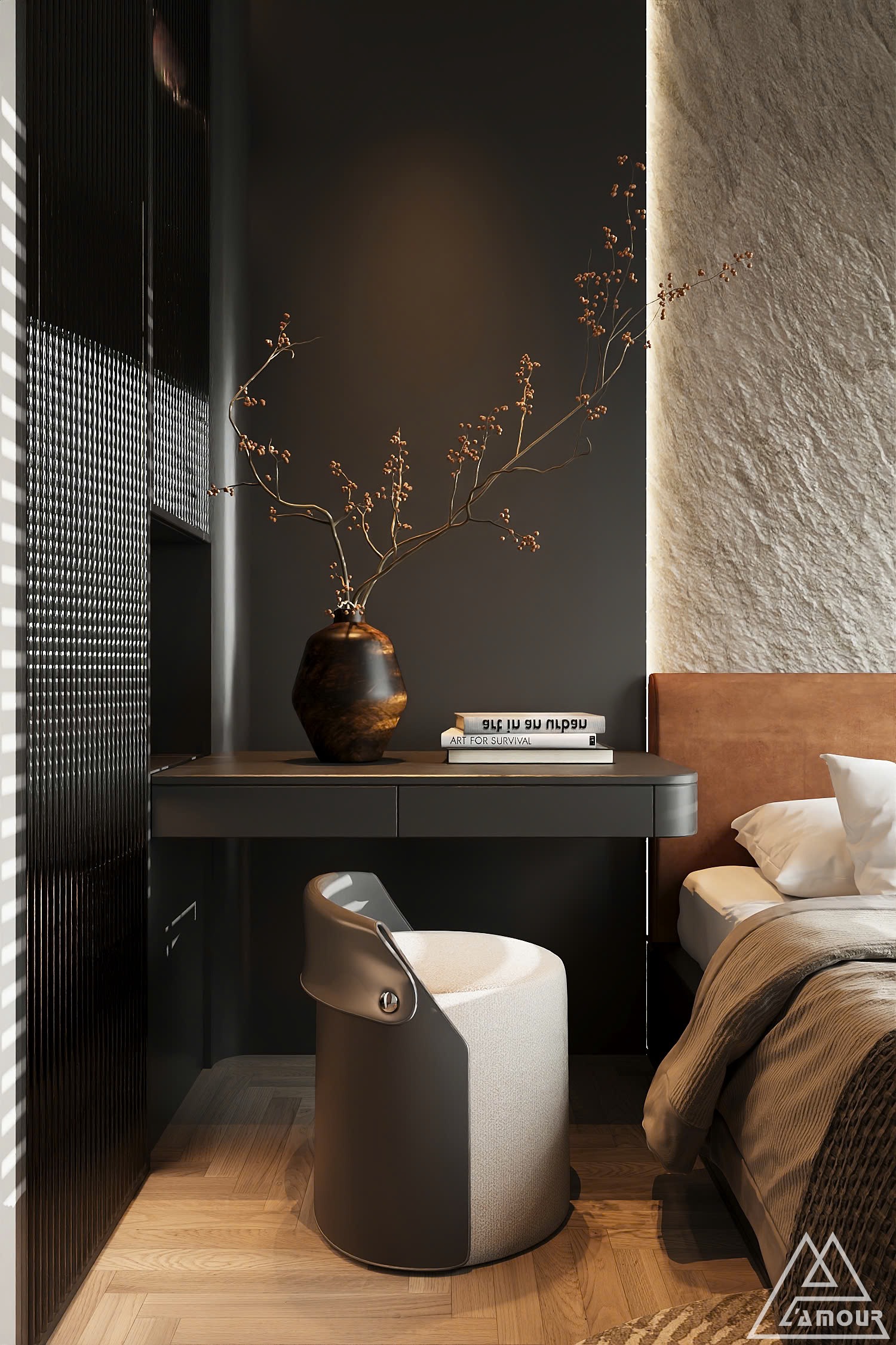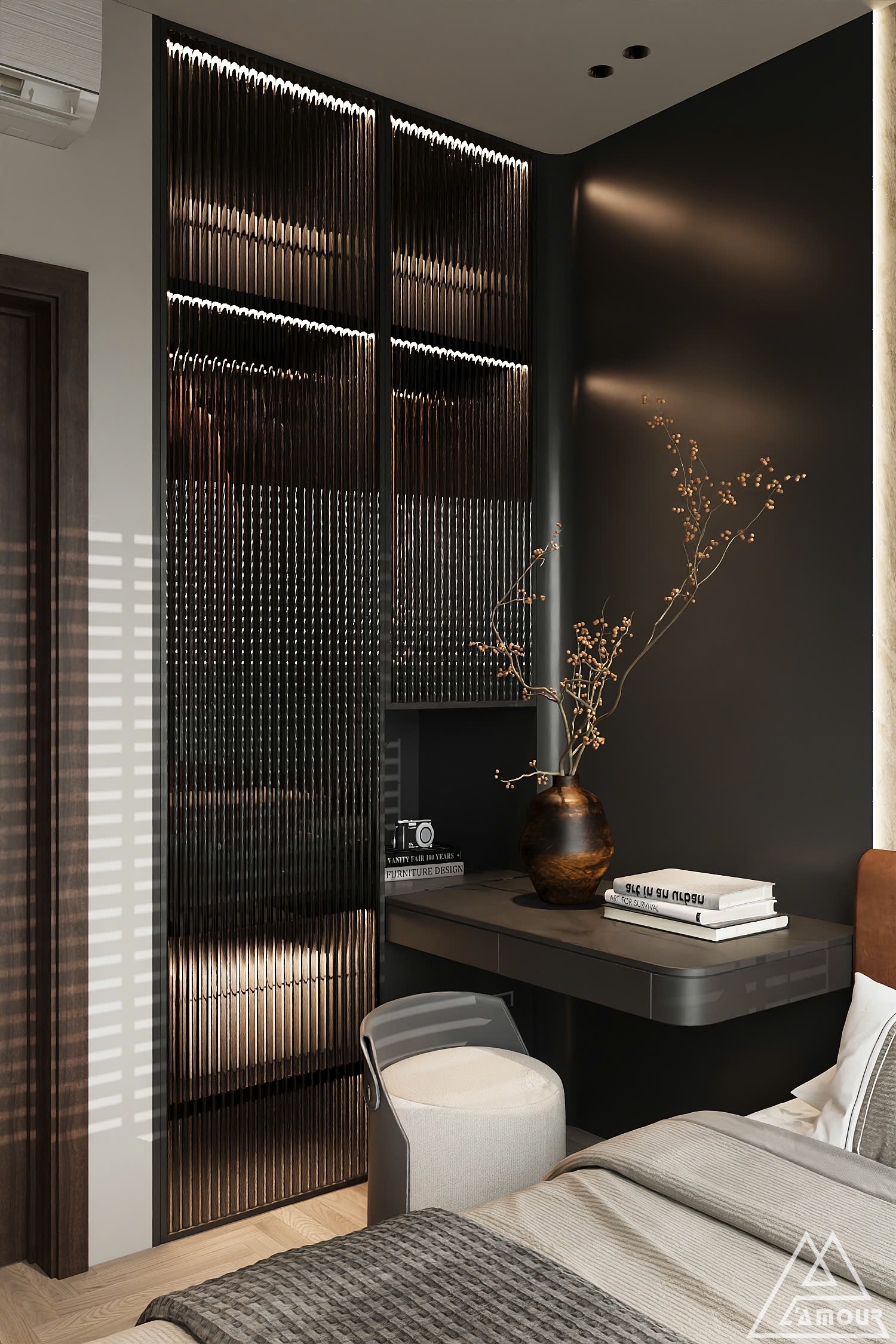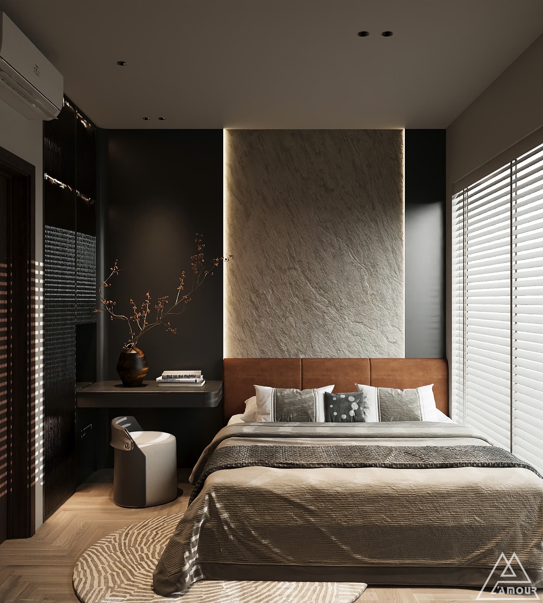 Không gian nghỉ ngơi trong căn hộ được L’amour Design khai thác theo hai sắc thái đối lập nhưng bổ trợ cho nhau. Phòng ngủ master mang gam đen – xám chủ đạo, tạo sự sang trọng, hiện đại và kín đáo. Ánh sáng được tiết chế vừa đủ giúp không gian trở nên trầm lắng, sâu và riêng tư – đúng tinh thần của một nơi để cơ thể và cảm xúc được thả lỏng hoàn toàn.