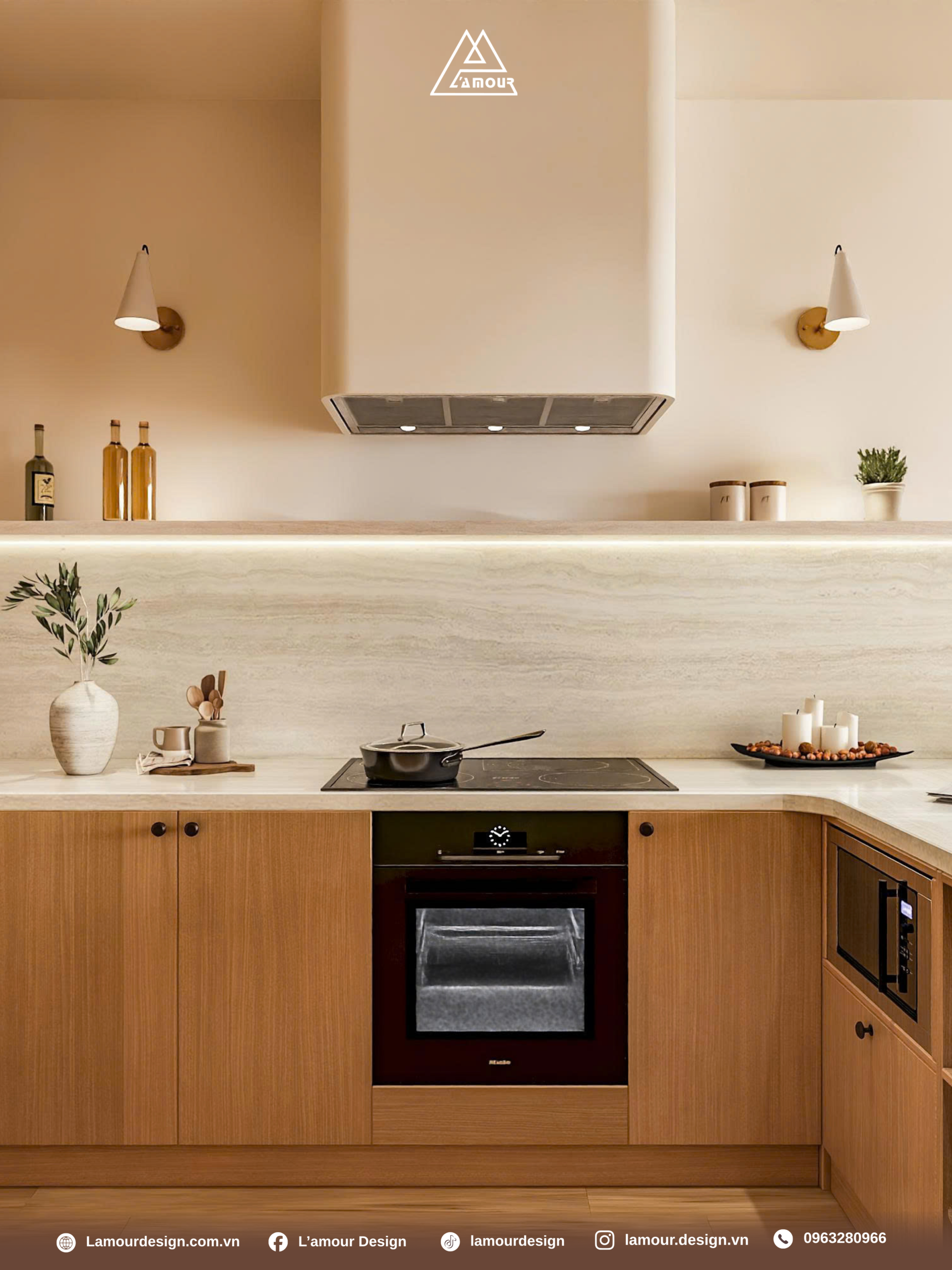 Cách bố trí bếp chữ L giúp tối ưu hóa tam giác công năng (nấu – rửa – lưu trữ). Các khoang chứa thiết bị điện tử được đo đạc chính xác để lắp âm gọn gàng, vừa đảm bảo sự tiện nghi vừa giữ cho căn bếp luôn trong trạng thái ngăn nắp chuẩn phong cách Minimalism.