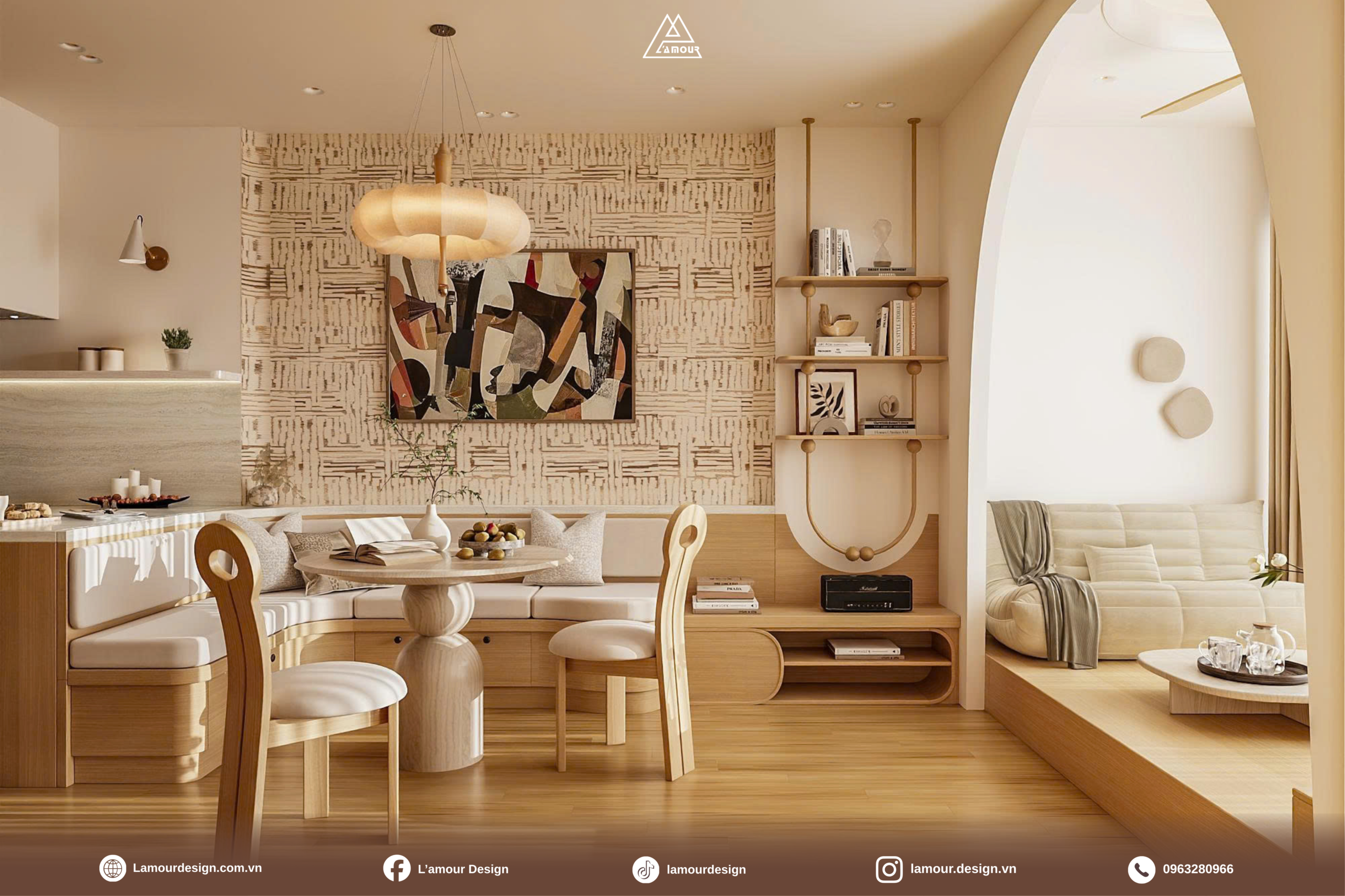 Khu vực ăn uống được xử lý cực kỳ khéo léo để không chiếm quá nhiều diện tích mà vẫn đủ sức hút. Thay vì sử dụng những chiếc ghế rời chiếm nhiều diện tích giao thông, L’amour Design lựa chọn hệ ghế băng dài áp tường uốn cong theo góc nhà kết hợp cùng bàn tròn gỗ mộc. Giải pháp này không chỉ tối ưu hóa mặt sàn mà còn tạo ra một góc ăn uống ấm cúng.